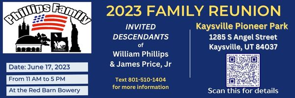 Welcome to the website for the 2023 Phillips & Price Family Reunion. If you claim descendantcy from both Thomas Gwillum Phillips or George Price. |